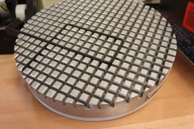 Featuring a precision-machined square grid pattern on a round face, this chuck is designed for operators who need to secure irregular shapes, multiple small components, or off-center parts on a lathe or rotary table.